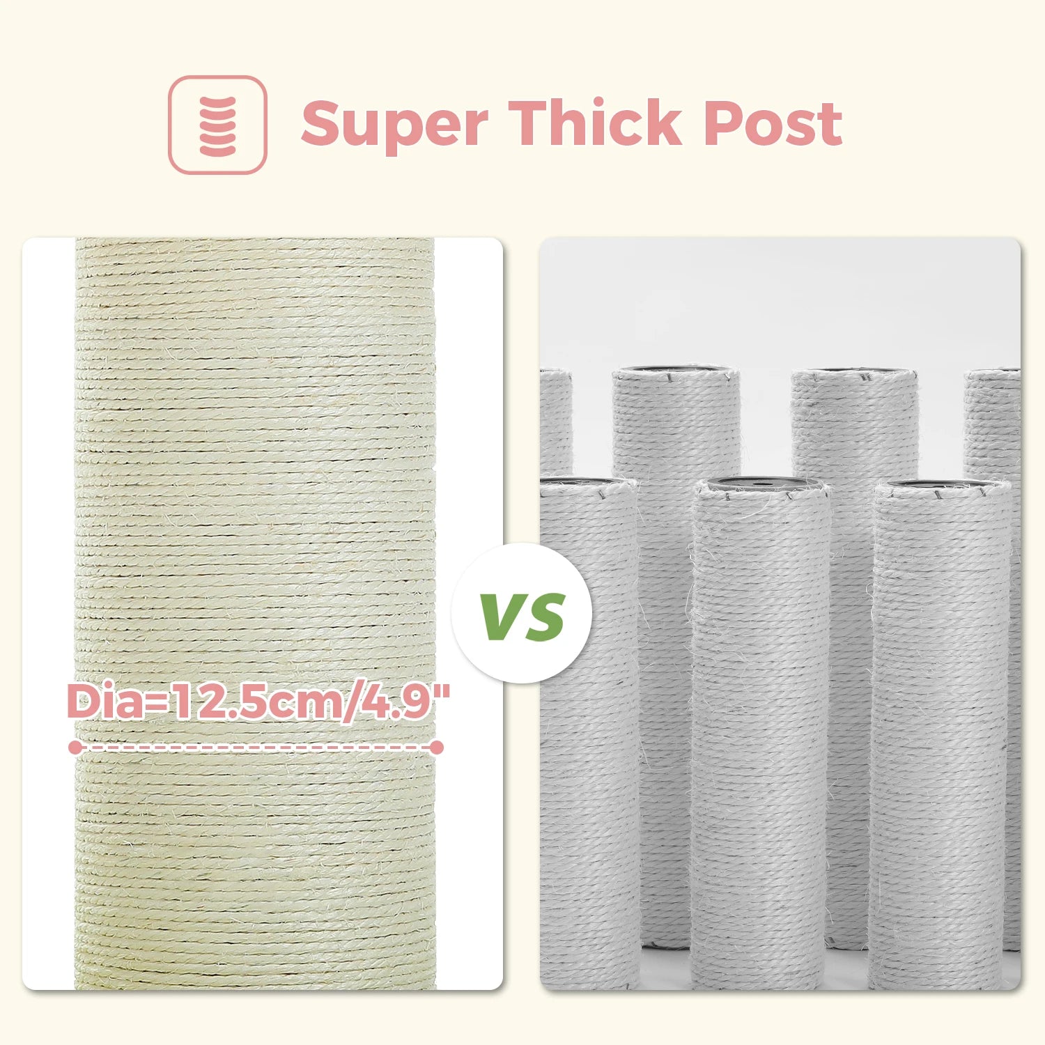 Super Thick Post: The natural sisal covered post's diameter reaches to 4.9'' that is larger than almost 80% cat scratcher at the market, ensuring a large area for your cats to fulfill their daily scratching needs. Besides, this thick cat scratching post double secure the stability of the whole cat tree, efficiently keep your baby away from your expensive furniture