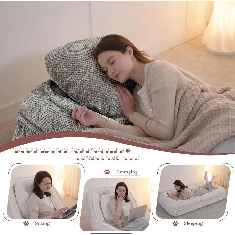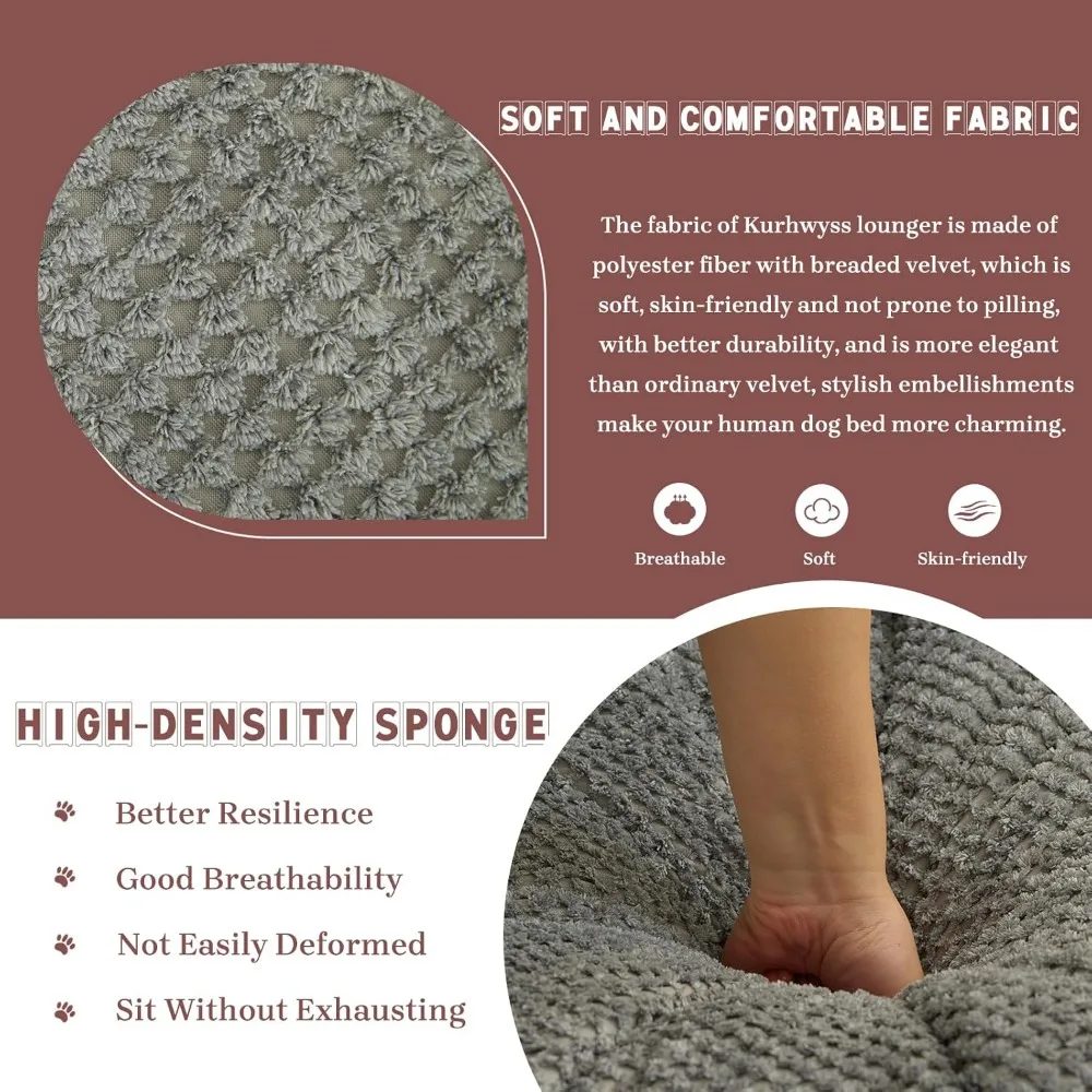 - Comfortable & Relaxing Sitting Position ⇒ This dog bed for humans is filled with fluffy doll cotton and high resilience foam, the full padding can provide you with great comfort and support. The surface is covered with selected polyester fiber, which is breathable and wear-resistant. What's more, the two removable pillows can be used as pillows, backrests or sleeping pads to meet your different needs.
